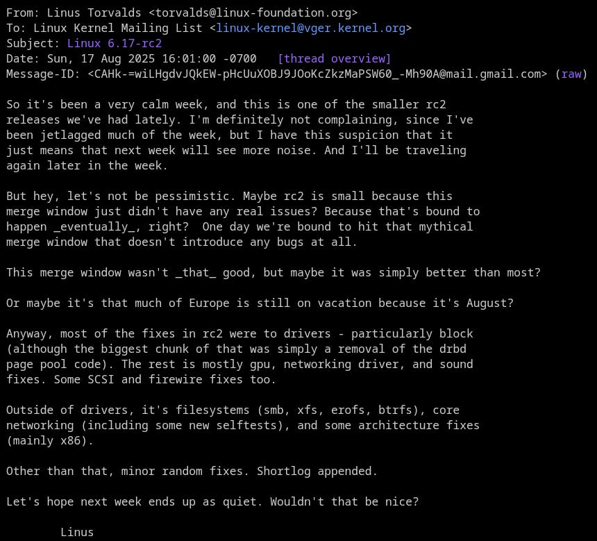 Linus released a smaller-than-usual 6.17-rc2 this week, calling it "one of the smaller rc2 releases we've had lately." The release focuses primarily on driver fixes with the largest change being removal of the drbd page pool code from the block subsystem.