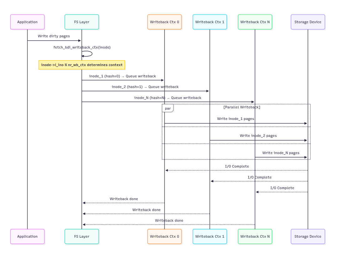 However, large folios only addresses the efficiency of sequential processing within a single thread. They do nothing to address the fundamental serialization bottleneck of having a single writeback thread per block device, which becomes increasingly problematic as storage devices gain parallel processing capabilities.
