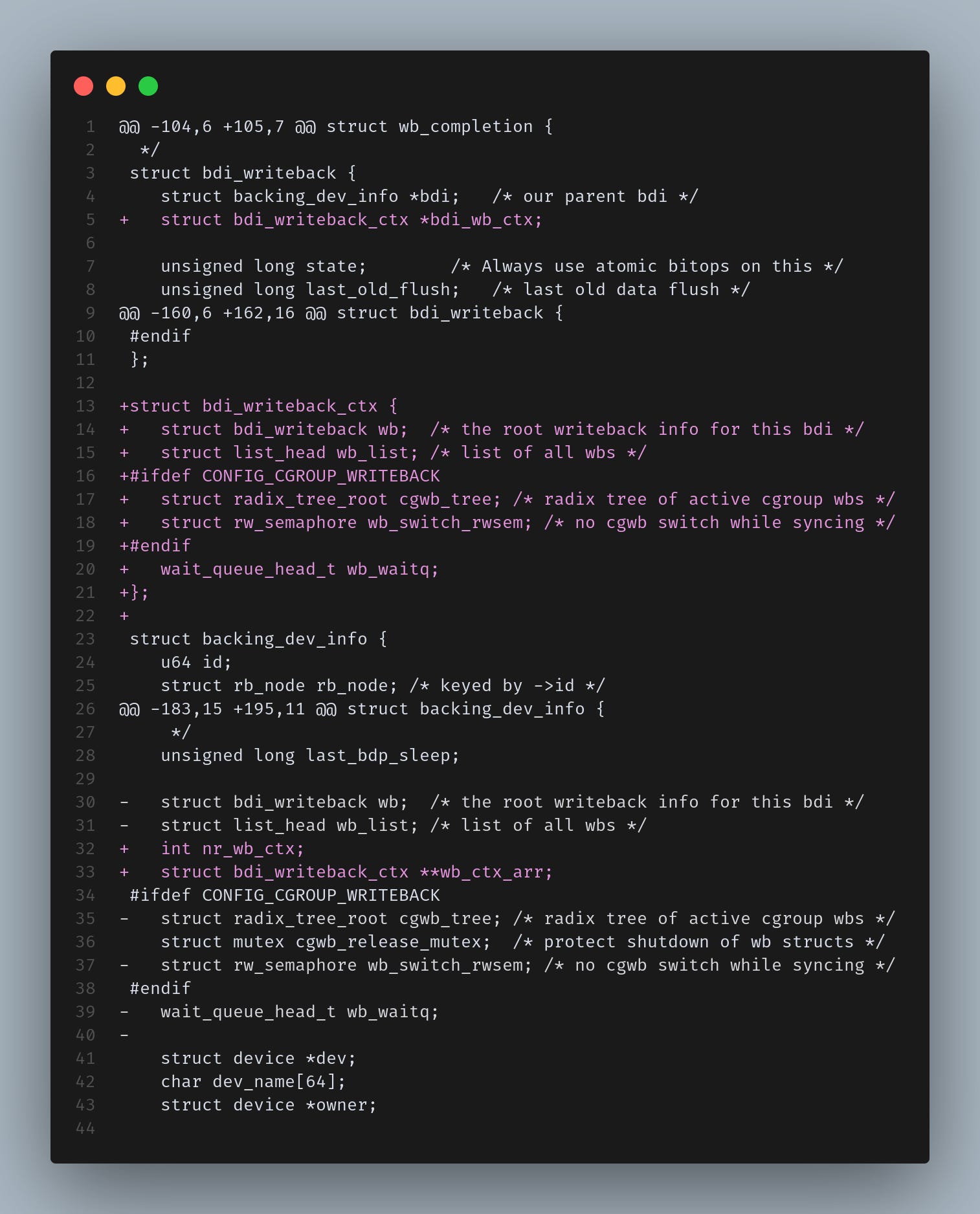 bdi_writeback_ctxembeds its ownstruct bdi_writebackand links back to its parent context via abdi_wb_ctxpointer.