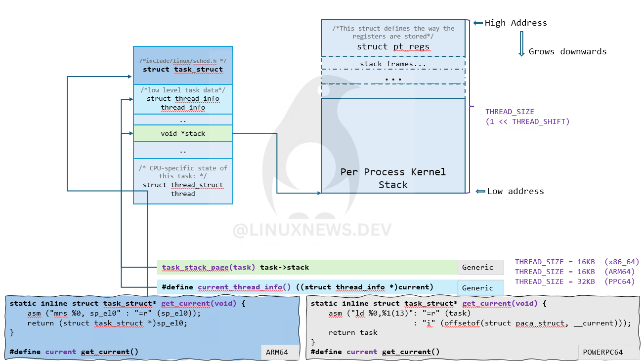 and the per-process kernel stack across architectures like x86_64, ARM64, and PPC64. A neat peek under the kernel hood!"